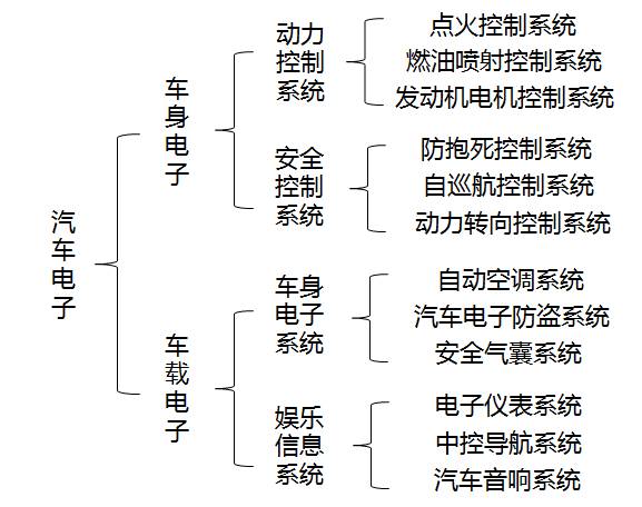 具體來說,汽車電子是電子信息技術(shù)與汽車傳統(tǒng)技術(shù)的結(jié)合,是車體汽車電子控制裝置和車載汽車電子控制裝置的總稱。具體分類如下:
