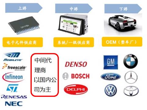 汽車電子行業(yè)的產(chǎn)業(yè)鏈相較于其他行業(yè)還是比較清晰的,其主要由三個(gè)垂直的層級(jí)構(gòu)成。分別是電子元件供應(yīng)商(Tier 2)、系統(tǒng)供應(yīng)商(Tier 1)和整車廠(OEM)。其中,上游電子元件的供應(yīng)商主要以國(guó)外的半導(dǎo)體巨頭為主,比如:飛思卡爾、瑞薩、英飛凌、英偉達(dá)等;中游系統(tǒng)供應(yīng)商基于Tier 2提供的各基礎(chǔ)產(chǎn)品,研發(fā)集成出一套系統(tǒng)供給整車廠,比如:影音娛樂導(dǎo)航系統(tǒng)、儀表系統(tǒng)等等,像電裝、博世、德爾福、航盛、華陽(yáng)等都屬于系統(tǒng)供應(yīng)商;下游整車廠就比較好理解了,整車廠把各個(gè)系統(tǒng)供應(yīng)商提供的產(chǎn)品在產(chǎn)線上進(jìn)行組裝和生產(chǎn),最終一臺(tái)新車下線。在這里值得一提的是,在上游和中游之間會(huì)存在一些中間代理商,主要以國(guó)內(nèi)的公司為主。