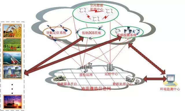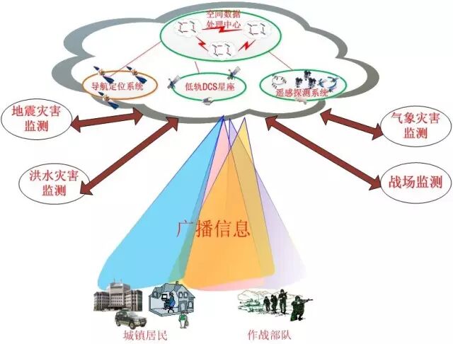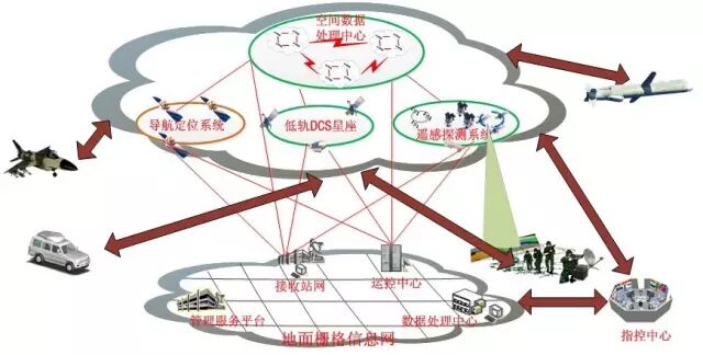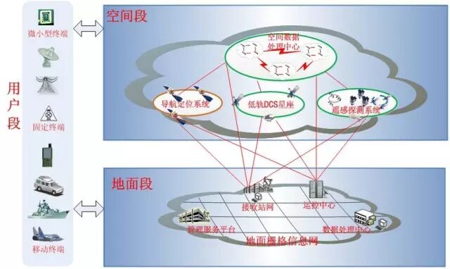 1) 空間段:天基通信系統(tǒng)(包括高軌通信系統(tǒng)、低軌DCS系統(tǒng))、導航定位系統(tǒng)、遙感探測系統(tǒng)、虛擬空間信息處理中心。