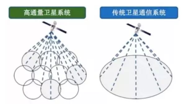 隨著高通量衛(wèi)星技術(shù)出現(xiàn),通過(guò)點(diǎn)波束技術(shù),使得衛(wèi)星容量成倍增加,如下圖所示: