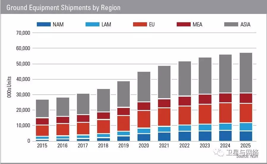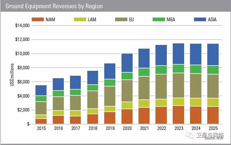 未來十年,亞洲累計收入將超過270億美元,顯而易見,地面終端設備市場機會相當可觀。此外,地面段中的技術發(fā)展是衛(wèi)星通信產(chǎn)業(yè)新市場的敲門磚。