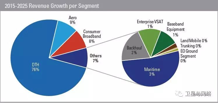 亞洲的主要發(fā)展動力是DTH,由于有大量的終端要投放市場,2015-2025年期間,其累計收入將達199億美元。緊隨其后的分別是衛(wèi)星地球站設備、航空終端、家庭寬帶、海事VSAT、EO和基站中繼,累計收入分別為27億、14億、6.19億、4.63億、4.31億、3.19億美元。相對來說,陸地移動和IP中繼的市場規(guī)模要小得多。