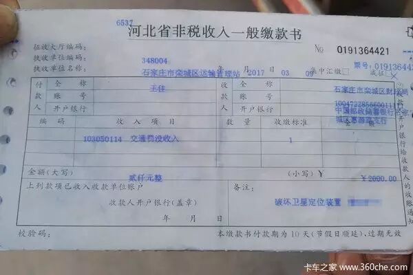 罰款單上寫的也比較明白,破壞衛(wèi)星定位裝置,也就是我們常說的北斗。卡友介紹是因為車輛因為某些原因換過駕駛室總成后,還沒來得急裝上北斗就上路運營,后來被檢查到?jīng)]有安裝定位裝置而被開出罰單。